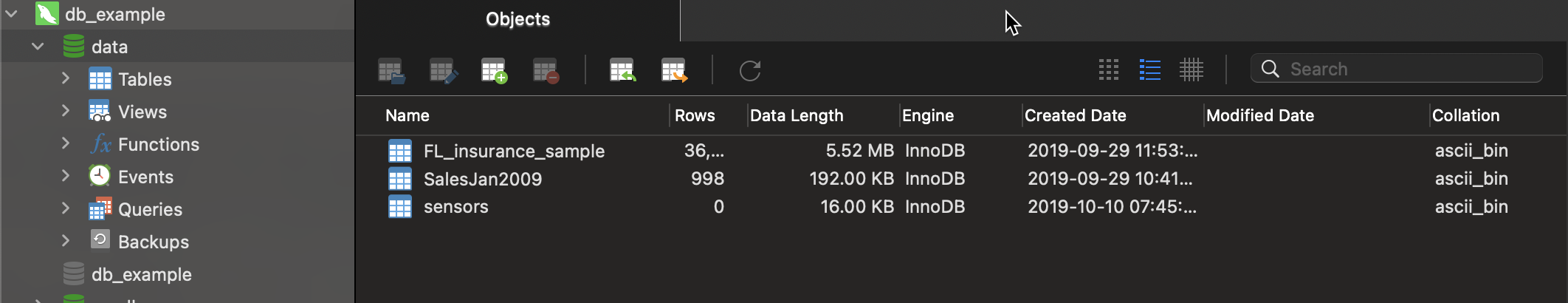 在上面 data 是我们在 MySQL 中的数据库。sensors 以及 SalesJan2009 是 data 数据库中的表格: