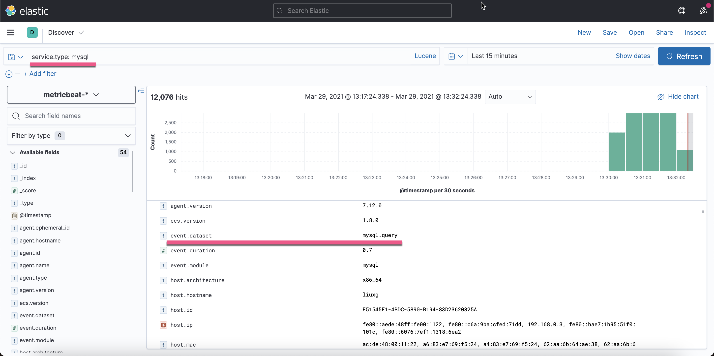 从上面我们可以看出来。event.dataset 来自 mysql.query 还是有蛮多的数据的。