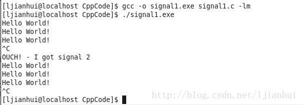{// 改变终端中断信号SIGINT的默认行为,使之执行ouch函数// 而不是终止程序的执行(void) signal(SIGINT, ouch);while(1){printf("Hello World!\n");sleep(1);}return 0;