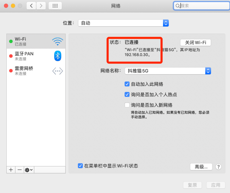 查询到本机IP 192.168.0.30,然后打开手机,找到wifi 连接和电脑同一个网络
