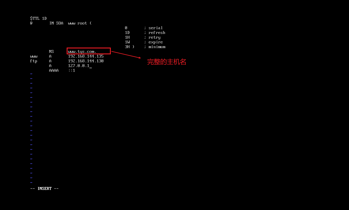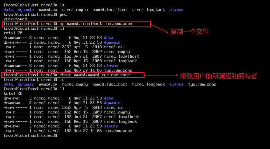 4,进入 /var/named 路径下,复制named.localhost,以它为模板进行配置数据源文件的配置。同时要注意对文件所有者的修改。