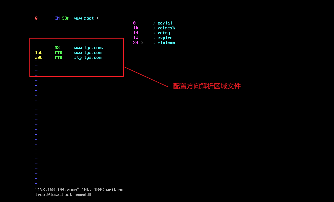 DNS的两个文件: 主配置文件:/etc/named.conf 用来配置本地监听的端口网络 ,定义DNS 区域和允许哪个网络请求访问查询 /var/named/ 定义区域文件,即dns数据库文件。