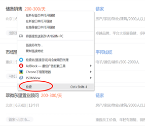 需要爬取的字段需要点击岗位标题的超链接,在打开新的页面中才能找到,因此,我们需要先爬取所有岗位详情对应的url。在chrome浏览器中,在岗位标题上右键,点击【检查】,在打开的页面中定位需要获取url的html定位信息。