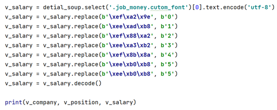 工资范围信息爬取成功,但是显示是乱码,应该是网站防止关键信息被爬取,对工资范围信息的数据进行了加密处理。最简单的解码方式就是重新进行utf8编码,分别建立utf8编码和数字0~9的对应关系,爬取信息后根据0~9的对应关系批量替换,实现数字的展示。