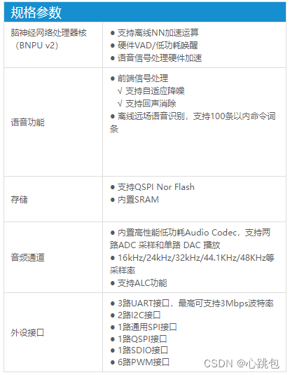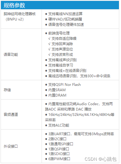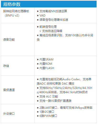 该芯片从语音输入开始,语音检测,语音特征提取及 DNN 运算完全采用硬件架构设计, 软件主要进行语音解码和语音播报。该芯片具有较高的运算性能及低成本、低功耗、小尺寸 等优势。