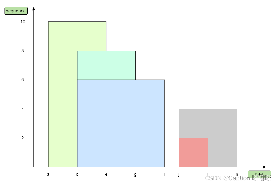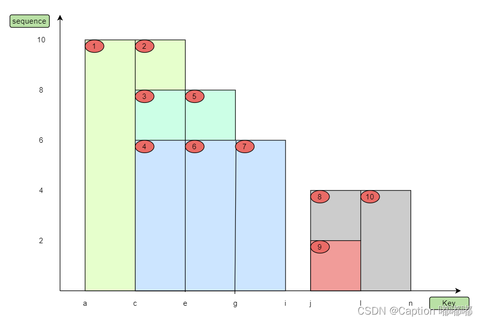 我们可以看出是由 key 和 sequence 两个维度来描述一个墓碑,代表在 sequence 时刻插入了一条墓碑值。一批墓碑可能产生重叠交叉等,下面是 5 条墓碑值: