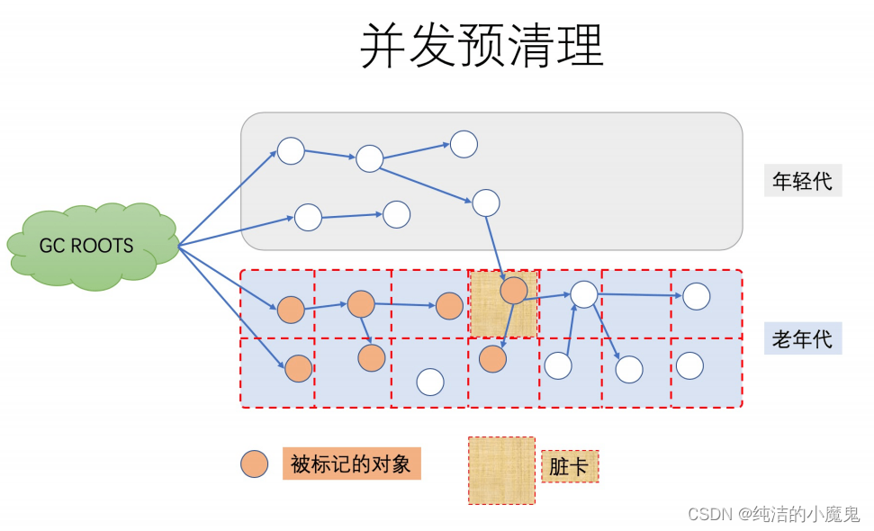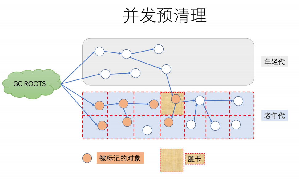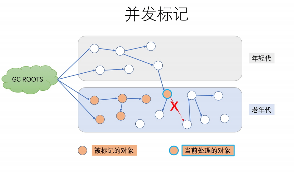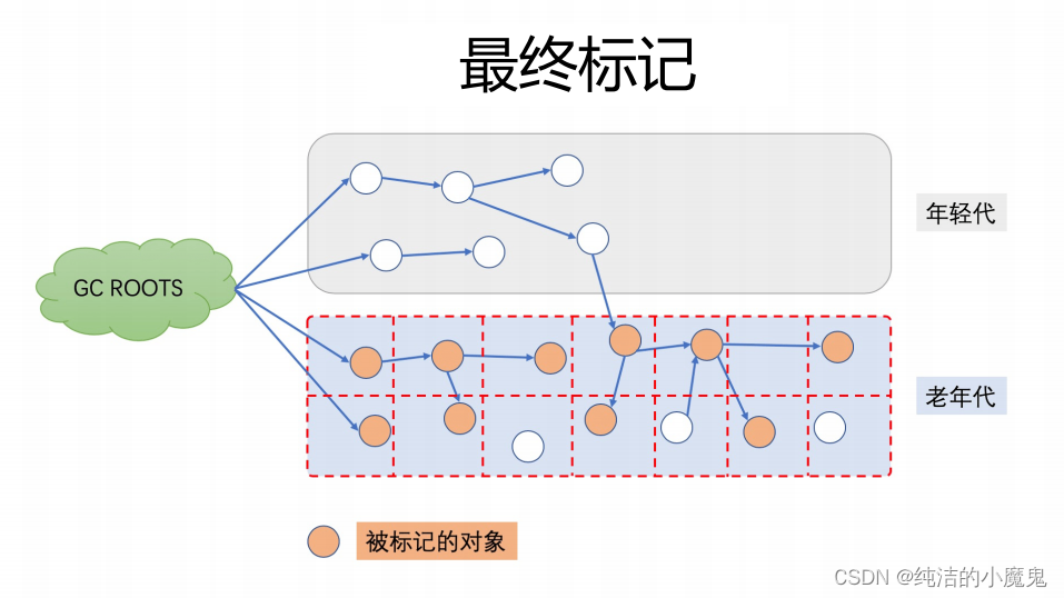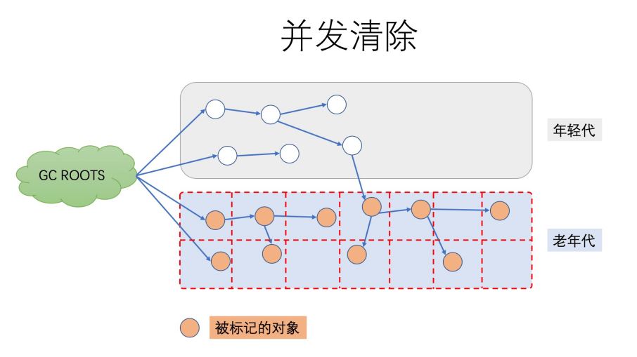 此阶段标记所有从 "根区域" 可达的存活对象。根区域包括:非空的区域,以及在标记过程中不得不收集的区域。