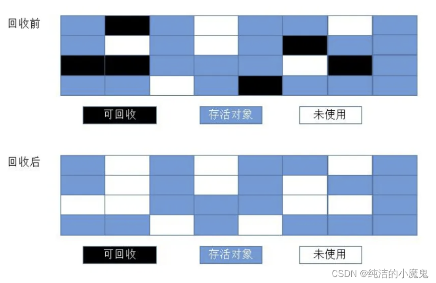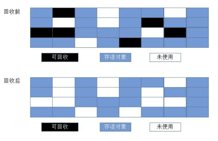 2. 根据老年代的特点,产生了一种"标记-整理"算法,标记过程仍然与 "标记-清除" 算法一样,但后续步骤不是直接对可回收对象进行整理,而是让所有存活的对象都向一端移动,然后直接清理掉端边界以外的内存。