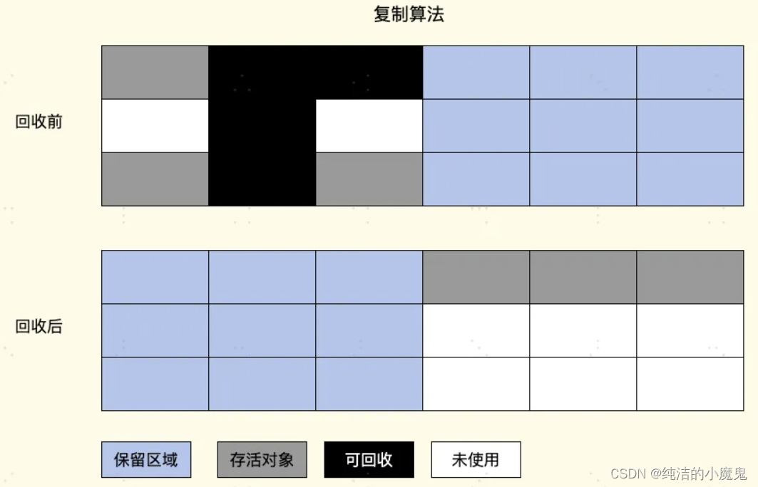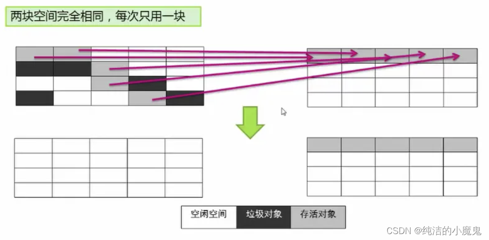 它将可用内存按容量划分为大小相等的两块,每次只使用其中的一块,当这一块的内存用完了,就将还存活着的对象复制到另外一块上面,然后再把已使用过的内存空间一次清除掉,这样使得每次都是对整个半区进行内存回收,内存分配时也就不用考虑内存碎片等复杂情况,只要移动堆顶指针,按顺序分配内存即可,实现简单,运行高效,只是这种算法的代价是将内存缩小为了原来的一半,代价很高。
