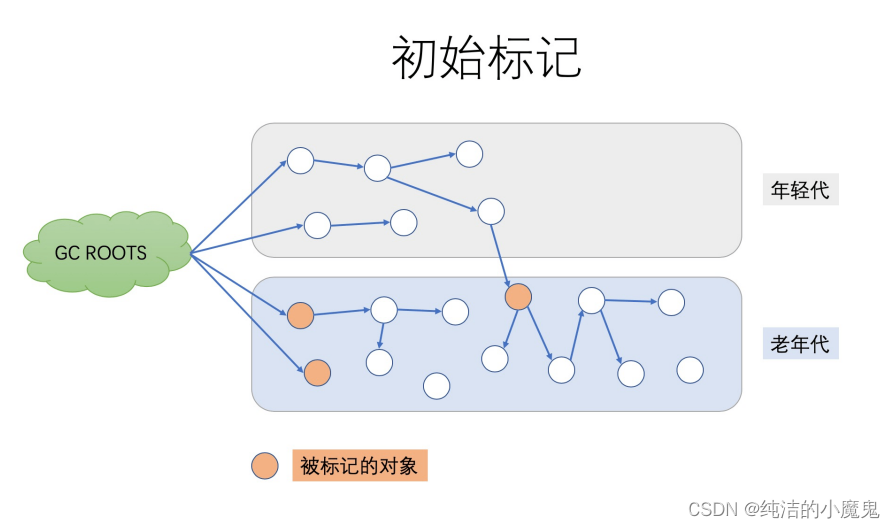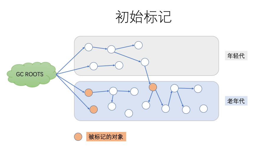 此阶段标记所有从 GC 根对象直接可达的对象。