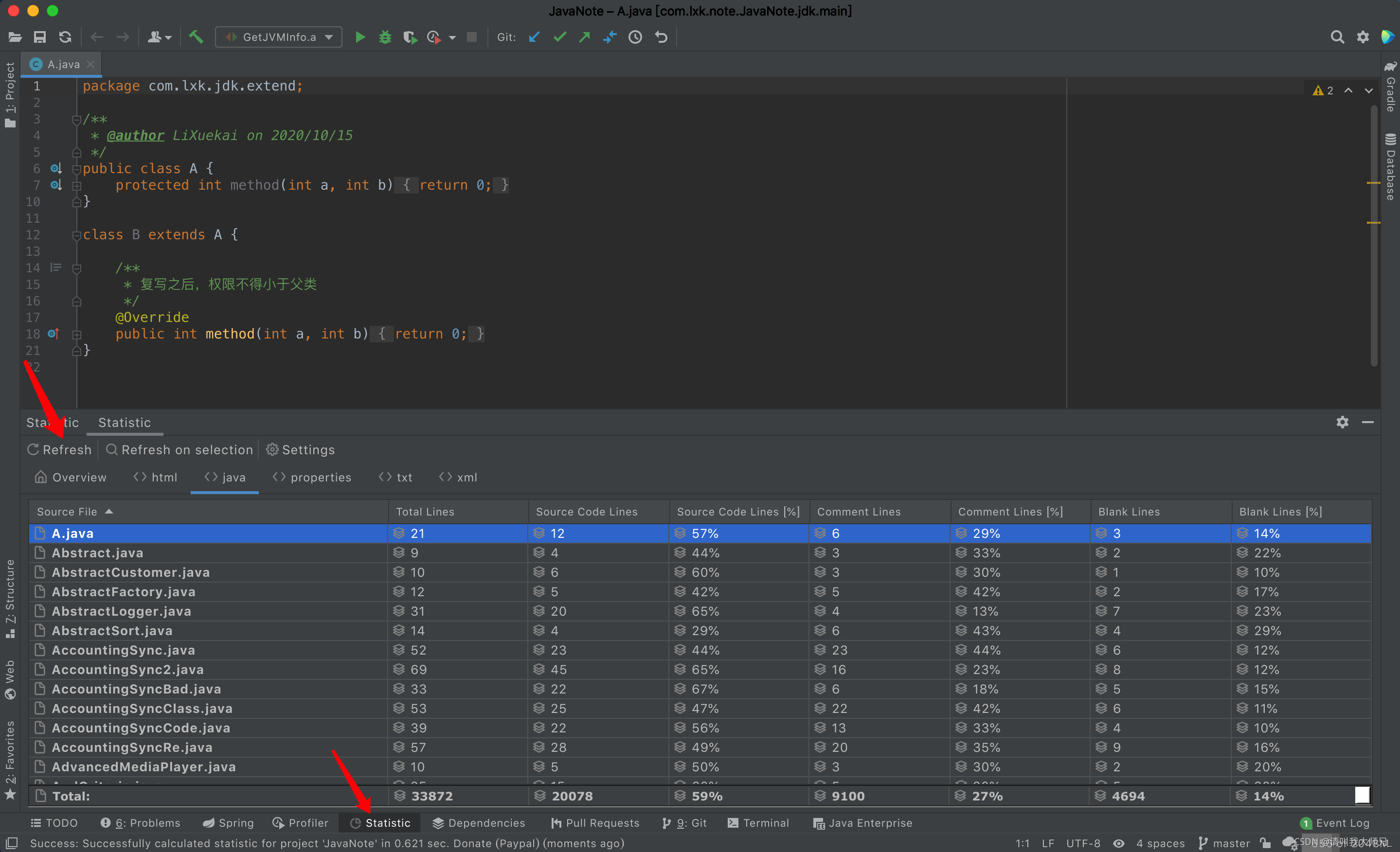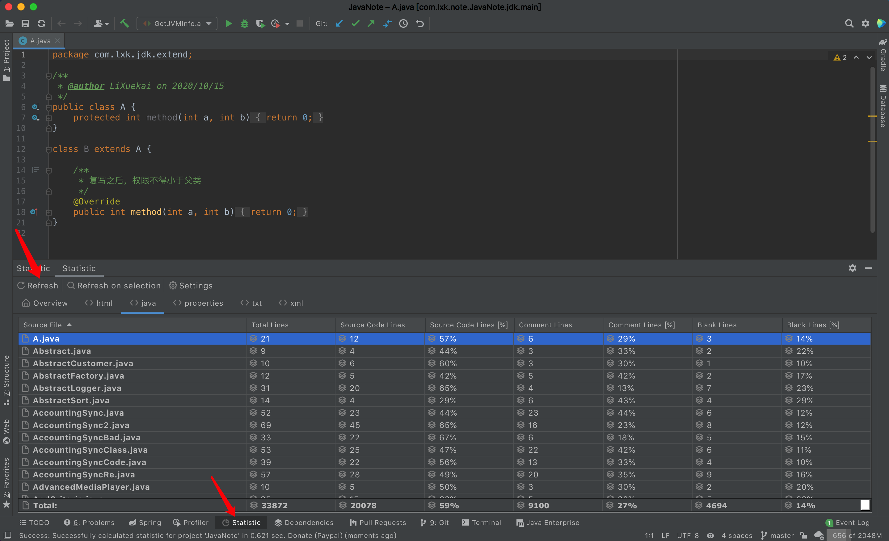 以这个A.class为例,总行数是21行,源码是12行,包括package,import,类声明等等。注释是6行,空行是3行,然后是分别三种的百分比。最下面是整个项目的总计。这个截图只是针对java类型的文件,还可以选择不同类型的文件进行分析和统计。就不赘述了。 这么一来,你代码注释没,通过这个注释的百分比就能看出来。