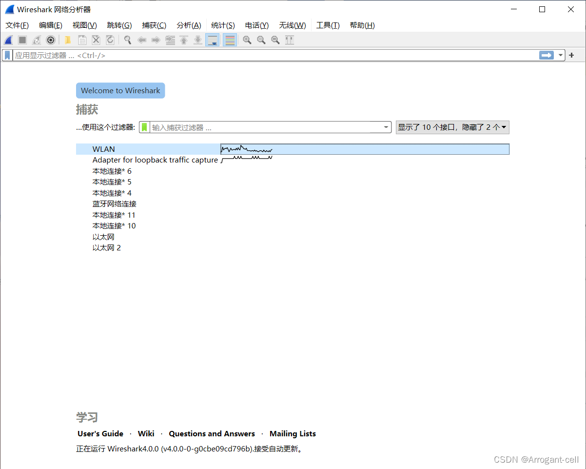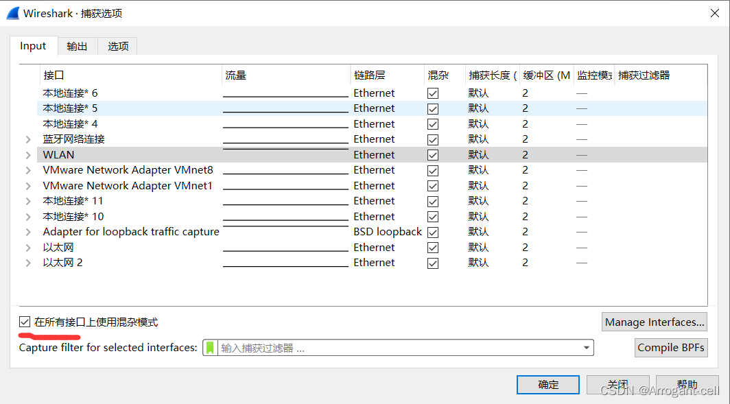 点击 捕获-->选项,取消勾选“在所有接口上使用混杂模式”,选择自己需要的网卡,例如WLAN,点击确定即可;进行此步骤的操作是为了方便后面的抓包分析,排除干扰项,此步骤可以根据自己需要选择做或者不做