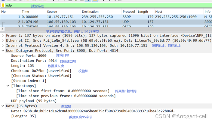 进行抓包,启动Wireshark,登录qq程序,或者其他方法都可以可以捕获到许多UDP包,通过过滤器输入udp进行过滤即可,分析如下: