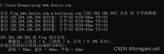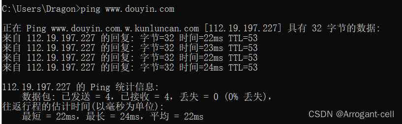 然后在cmd中,使用ping命令,ping一个ip地址,建议ping同一局域网下的ip ,这里就ping www.douyin.com ,如下: