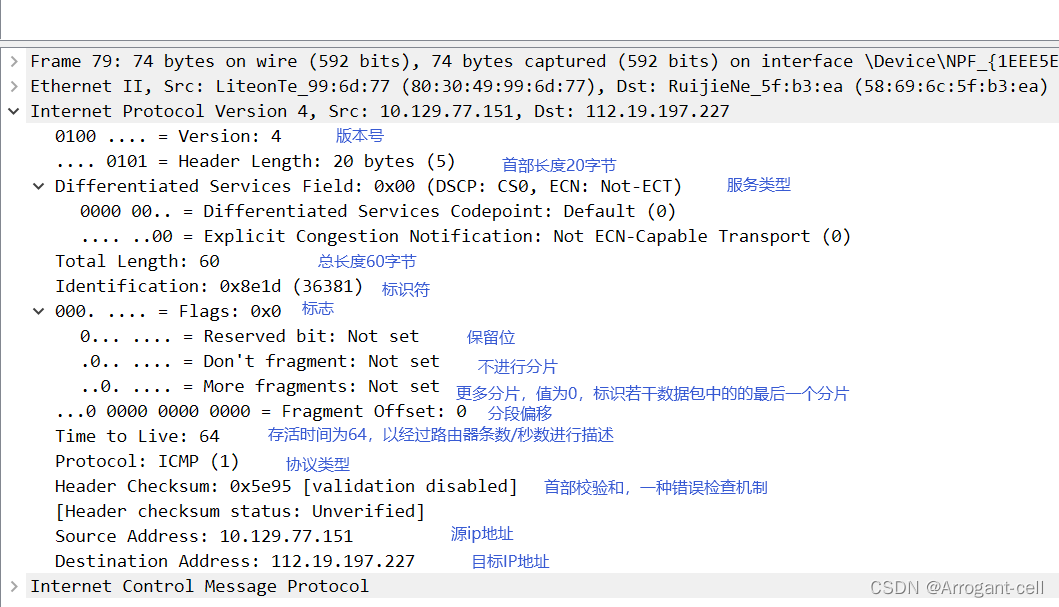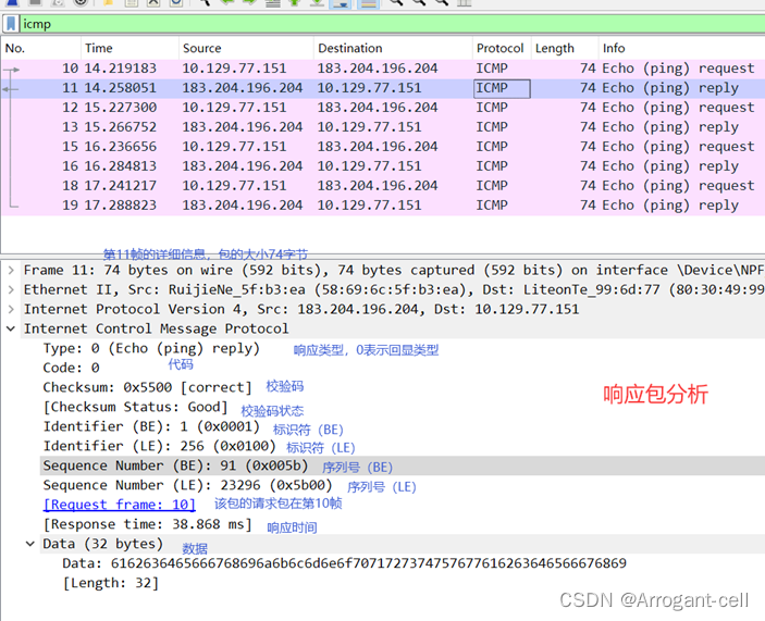 其中Internet Control Message Protocol 表示ICMP协议包信息。
