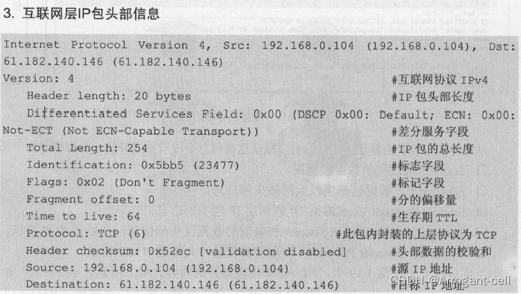 - Internet Protocol Version 4:互联网层IP包头部信息。