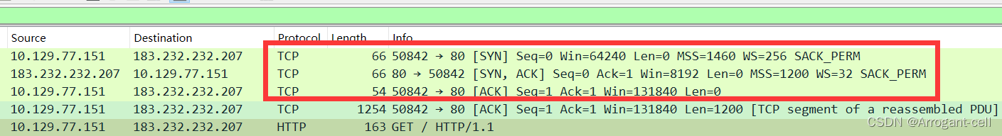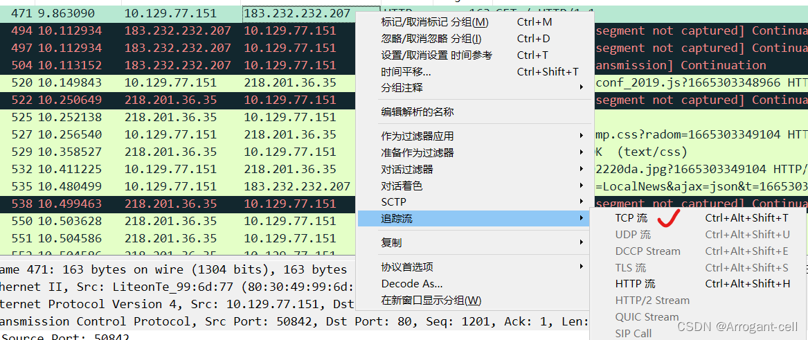 选中一个http记录,右键—>追踪—>tcp流,即可看到一个完整的tcp三次握手。