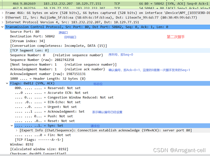第二次与第三次握手字段与第一次基本相同,主要是Ack与Seq的值