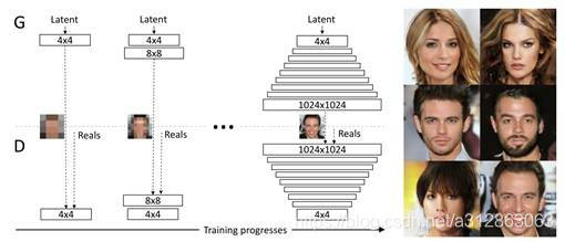 如果现在我们想生成超高分辨率的图像,譬如1024×1024图片,假设我们采用StackGAN或者是LapGAN的话,我们需要用到的GANs结构会非常多,这样会导致网络深度巨大,训练起来非常慢。为了解决这一问题,PGGAN(渐进式增长GAN)提出的想法是,我们只需要一个GANs就能产生1024×1024图片。但是一开始的时候GANs的网络非常浅,只能学习低分辨率(4×4)的图片生成,随着训练进行,我们会把GANs的网络层数逐渐加深,进而去学习更高分辨率的图片生成,最终不断的更新GANs从而能学习到1024×1024分辨率的图片生成。