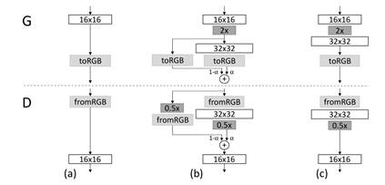 如上图所示,当把生成器和判别器的分辨率加倍时,会平滑的增强新的层。我们以从16 × 16像素的图片转换到32 × 32像素的图片为例。在转换(b)过程中,把在更高分辨率上操作的层视为一个残缺块,权重α从0到1线性增长。当α为0的时候,相当于图 (a),当α为1的时候,相当于图(c)。所以,在转换过程中,生成样本的像素,是从 16x16到 32x32转换的。同理,对真实样本也做了类似的平滑过渡,也就是,在这个阶段的某个训练batch,真实样本是: X=