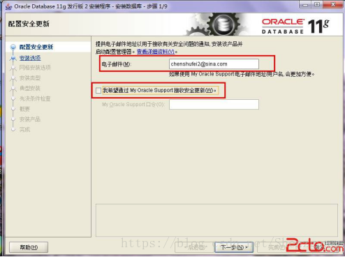3、安装第一步:配置安全更新,这步可将自己的电子邮件地址填写进去(也可以不填写,只是收到一些没什么用的邮件而已)。取消下面的“我希望通过My Oracle Support接受安全更新(W)”。 如图: