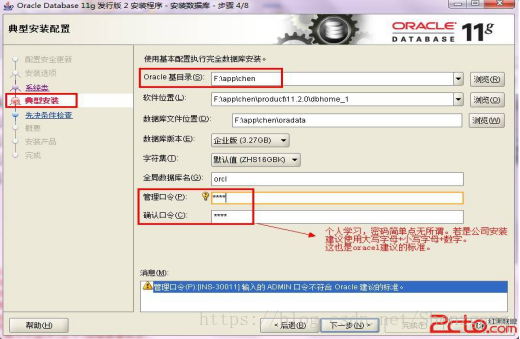 6、典型安装。 重要步骤。建议只需要将Oracle基目录更新下,目录路径不要含有中文或其它的特殊字符。全局数据库名可以默认,且口令密码,必须要牢记。密码输入时,有提示警告,不符合Oracel建议时不用管。 (因Oracel建议的密码规则比较麻烦, 必须是大写字母加小写字母加数字,而且必须是8位以上。麻烦,可以输入平常自己习惯的短小密码即可)如图:建议使用orcl作为密码 和数据库名一致。