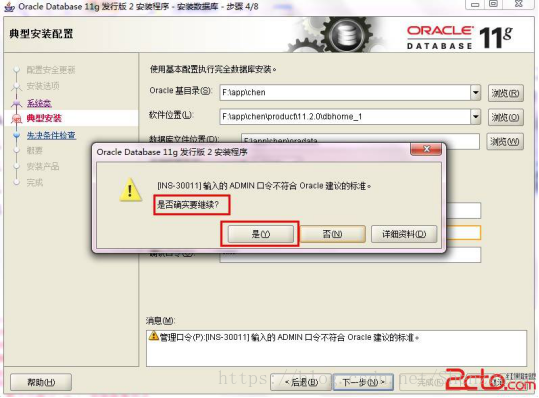 7、若输入的口令短小简单,安装时会提示如下。直接【是】继续安装就是了。如图: