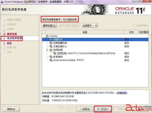 8、先决条件检查。 安装程序会检查软硬件系统是否满足,安装此Oracle版本的最低要求。 直接下一步就OK 了。如图: