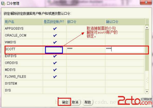 13、解锁scott账户,去掉前面的绿色小勾,输入密码tiger。也可以输入平常用的短小的密码,反正不必非得按oracle建议的8位以上大小写加数字,如图:对SYSTEM、SYS用户设置密码 为 orcl。
