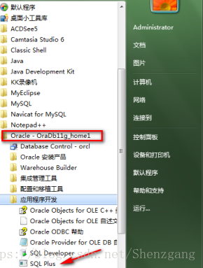 可以通过开始,所有程序中的 "Oracle -OraDb11g_home1" -> "应用程序开发" -> "Sql Plus" 连接。如图: