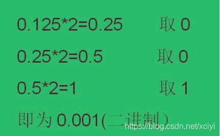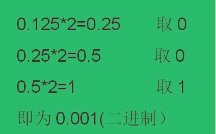 十进制的小数转为二进制,主要是小数部分乘以2,取整数部分一次从左往右放在小数点后,直至小数点后为0(就是为整数时)