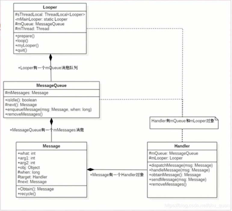 源码中调用 msg.target.dispatchMessage(msg); target就是一个handler 是中转器 (/*package*/ Handler target;)