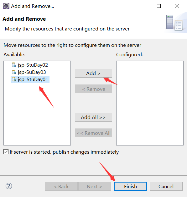 上面的代码保存后,打开控制台,选择server选项卡,然后先选中Tomcat v9.0…这一行,右键选择Add and Remove