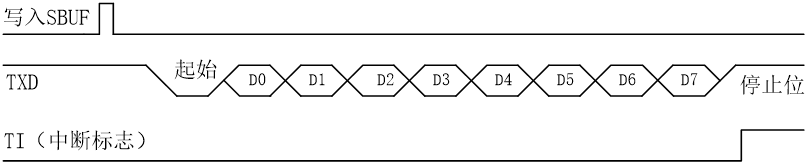 发送开始时,先把起始位0输出到TXD引脚,然后发送移位寄存器的输出位(D0) 到TXD引脚。每一个移位脉冲都使输出移位寄存器的各位右移一位,并由TXD引脚输出。第一次移位时,停止位“1”移入输出移位寄存器的第九位上,以后每次移位,左边都移入0.当停止位移至输出位时,左边其余位全为0,检测电路检测到这一条件时,使控制电路进行最后一次移位,并置T1=1,向CPU请求中断。
