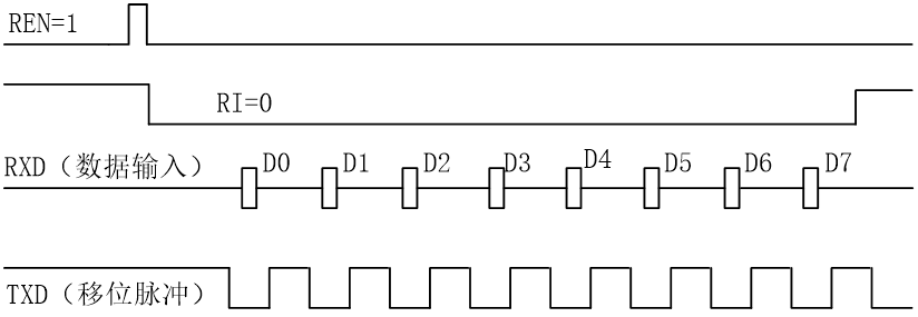 接收时,数据从右边移入输入移位寄存器,在起始位0移到最左边时,控制电路进行最后一次移位。当RI=0,且SM2=0(或接收到的第9位数据为1)时,接收到的数据装入接收缓冲器SBUF和RB8(接收数据的第9位),置RI=1,向CPU请求中断。如果条件不满足,则数据丢失,且不置位RI,继续搜索RXD引脚的负跳变。