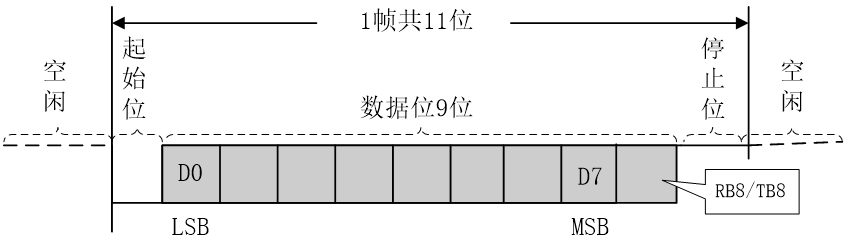 方式2和方式3时起始位1位,数据9位(含1位附加的第9位,发送时为SCON中的TB8,接收时为RB8),停止位1位,一帧数据为11位。方式2的波特率固定为晶振频率的1/64或1/32,方式3的波特率由定时器T1的溢出率决定。