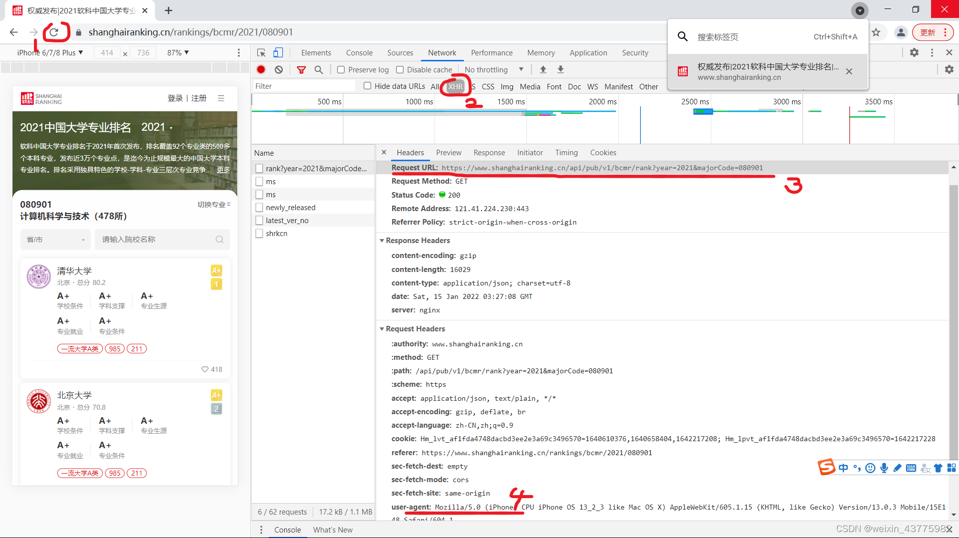 打开网页后,按住F12,然后点击步骤1刷新界面,然后点击步骤2XHR,点击左边Name下方第一行,然后可以看到步骤3的URL和步骤4的user-agent了。