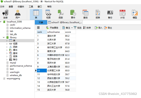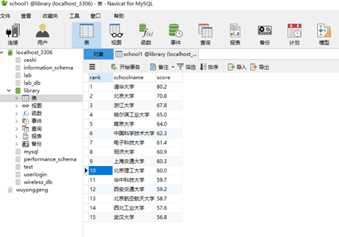 def writeDB(uinfo,num):"""写入MySQL数据库"""# host,user,password,databasedb = pymysql.connect(host="localhost", user="root",password="123456",database="library",charset="utf8")cur = db.cursor() #开启游标功能,创建游标对象try:tplt = "{0:^10}\t{1:^10}\t{2:^10}\t"for i in range(num):u = uinfo.loc[i]sql = "INSERT INTO `school1` (rank,schoolname,score) VALUES (%s,'%s',%f)" \% (str(u[0]), str(u[1]), float(u[2]))cur.execute(sql)db.commit()except:db.rollback() # 若发生错误则回滚cur.close()db.close()print("数据库写入成功!")