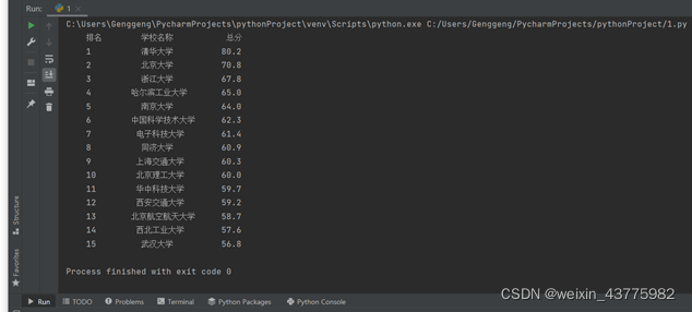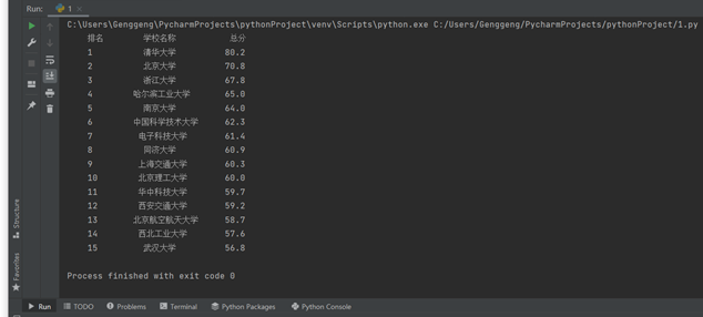 if __name__ == "__main__":# info = []headers = {"User-Agent": "Mozilla/5.0 (iPhone; CPU iPhone OS 13_2_3 like Mac OS X) AppleWebKit/605.1.15 ""(KHTML, like Gecko) Version/13.0.3 Mobile/15E148 Safari/604.1"}url = "https://www.shanghairanking.cn/api/pub/v1/bcmr/rank?year=2021&majorCode=080901"html = getHTMLText(url,headers)info = get_data(html)# printRank(info,15) # 注释的内容可根据不同的函数进行调用,也可自行做个switch循环,python没有自带这个循环,需要自行编写# writeDB(info,15)# deldteDB(info,15)# shujukeshihua()