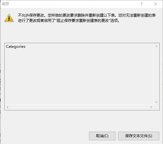不允许保存修改。您所做的更改要求删除并重新创建以下表。您对无法重新创建的表进行了更改或者启用了“阻止保存要求重新创建表的更改”选项。