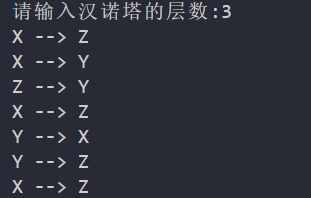 def hanoi(n, x, y, z):if n == 1:print(x, '-->', z) # 如果只有一层,直接从X移动到Zelse:hanoi(n-1, x, z, y) # 将前n-1个盘子从X移动到Yprint(x, '-->', z) # 将最底下的第64个盘子从X移动到Z上hanoi(n-1, y, x, z) # 将Y上的63个盘子移动到Z上n = eval(input('请输入汉诺塔的层数:'))