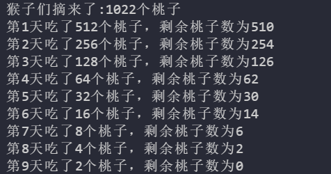 3.猴子吃桃。有一群猴子摘来了一批桃子,猴王规定每天只准吃一半加一只(即第二天吃剩下的一半加一只,以此类推),第九天正好吃完,问猴子们摘来了多少桃子?