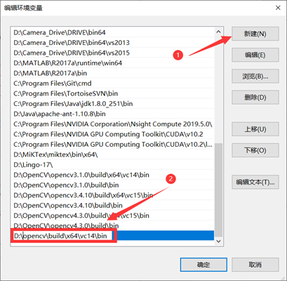 双击打开,点击添加(新建)路径 ,在文本框中输入路径 例如 D:\opencv\build\x64\vc14\bin