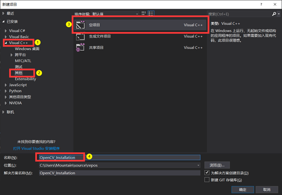 Visual C++ -> 其他 -> 空项目 -> 名称自取(例如OpenCV_Installation)