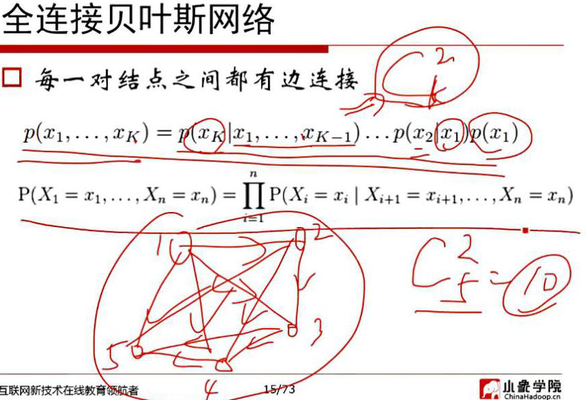 这是一个全连接的,也就是任何两个结点之间都是相连的,这是我们最不希望的,它把所有的边都保留着,那就意味着建立这么一个模型比较复杂,甚至可能会过拟合。所以我们研究正常的贝叶斯网络: