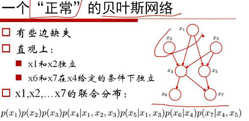 比如我们现在就研究x4吧,它有一个孩子结点是x6,有一个是x7,我们甚至于可以这么来讲,当然x6和x7显然是不独立的,但现在如果是在给定了x4这个节点的前提之下他们是否又是独立的呢?所以说在这里边有一些很有趣的事情发生,这么一个贝叶斯网络其实我们可以这么来去看待它,首先这么一个东西我们可以求的这么一个联合概率,而在里面因为有些边缺失,本来