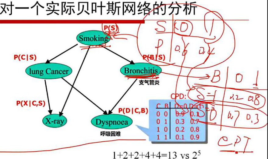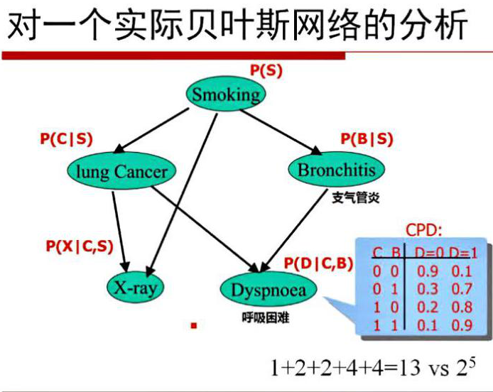 我们需要给出一些它的概率的参数,你比方说,一个人抽烟,有可能会得lung Cancer,但也有可能会得Bronchitis这么一个很正常的疾病,但是不管是得Cancer还是Bronchitis都会造成Dyspnea,然后呢临床发现如果一个人得了Bronchitis他去照X光没有什么变化,如果得Cancer会很明显,即使没有得癌症但是抽烟可能也会对肺有一定的影响(照X光明显),那这么一来我们就可以得到一个有向的无环图。这个有向无环图不就是贝叶斯网络吗?