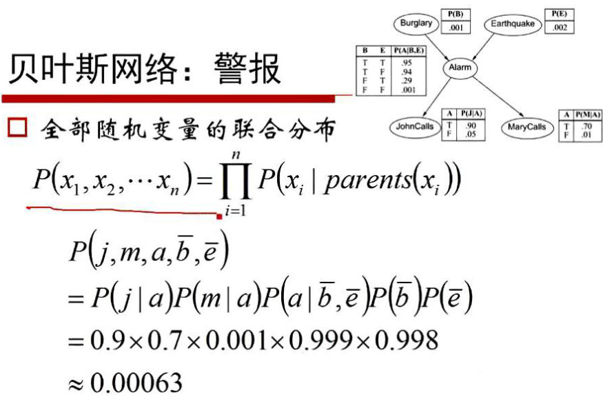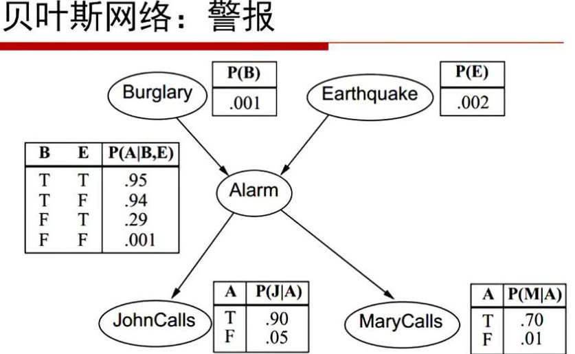 报警了如果是有陌生人进入室内,可能概率是0.001%,发生地震概率可能是0.002%,不管是有陌生人入内还是发生地震警报都会响起,然后警报响起不管是John还是Marry都会告诉我一声,而告诉我的概率分别是0.6和0.7,当然除了它们两是两个概率,因此总共需要10个参数来描述这么一个贝叶斯网络。然后就可以算出: