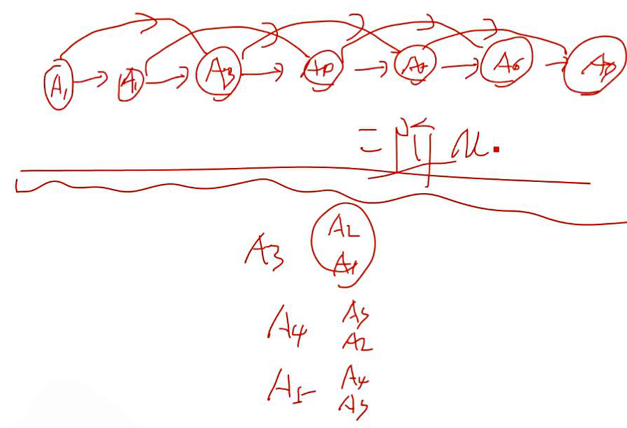 我们现在另加一些边,也就是A3不只和A2,也和A1有关系,A4与A3和A2都有关系,A5和A4和A3都有关系,这个我们叫做二阶马尔可夫网络。同样的A1跟A4也可以加上一条,A2A5、A3A6都可以加上一条,就可以造一个3阶的马尔可夫网络,甚至n阶的马尔可夫网络,但是模型会越来越复杂,因此需要在模型的精确度和复杂度之间取一个折中。但是我们往往不会去做这么高阶的模型。