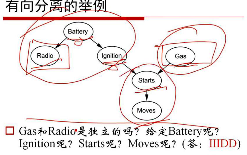 这个结点集合跟这个结点集合形成了这么个结点集合,它就是A,B会得到中间C的这么一个过程。而我不清楚C的情况,A和B就是独立的,A里面的某一个比如Radio就和Gas是独立的。也就是常识和理论值吻合的。我现在知道这个车是可以开起来的,你说我能不能听歌和油箱是否有油是不是独立的呢?这是不确定的。